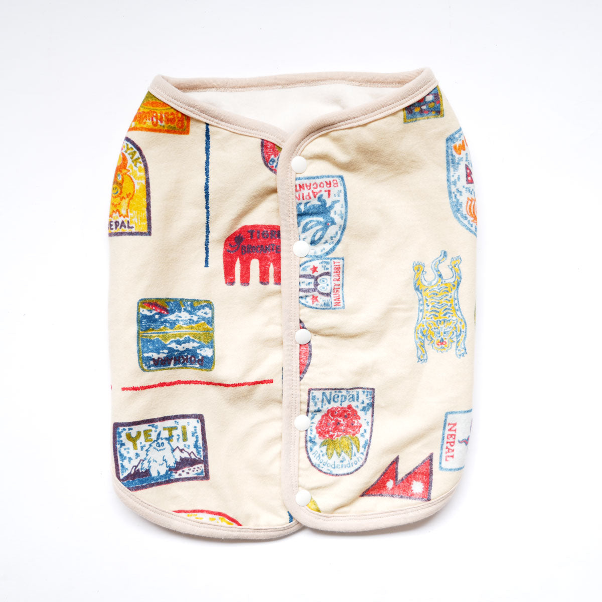 肌あたりの良いマイクロフリースと、キュートなプリント柄のネル素材を組み合わせたベストです。